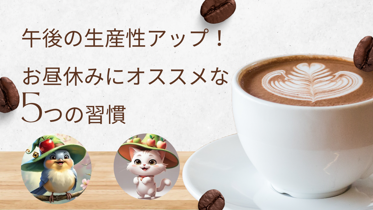 ほっとひと息の工夫 午後の生産性アップ!お昼休みにオススメな5つの習慣 午後になると集中力が切れがち…。そんな私が毎日続けている、お昼休みの過ごし方と小さな工夫をまとめました。 2025.06.02 ほっとひと息の工夫