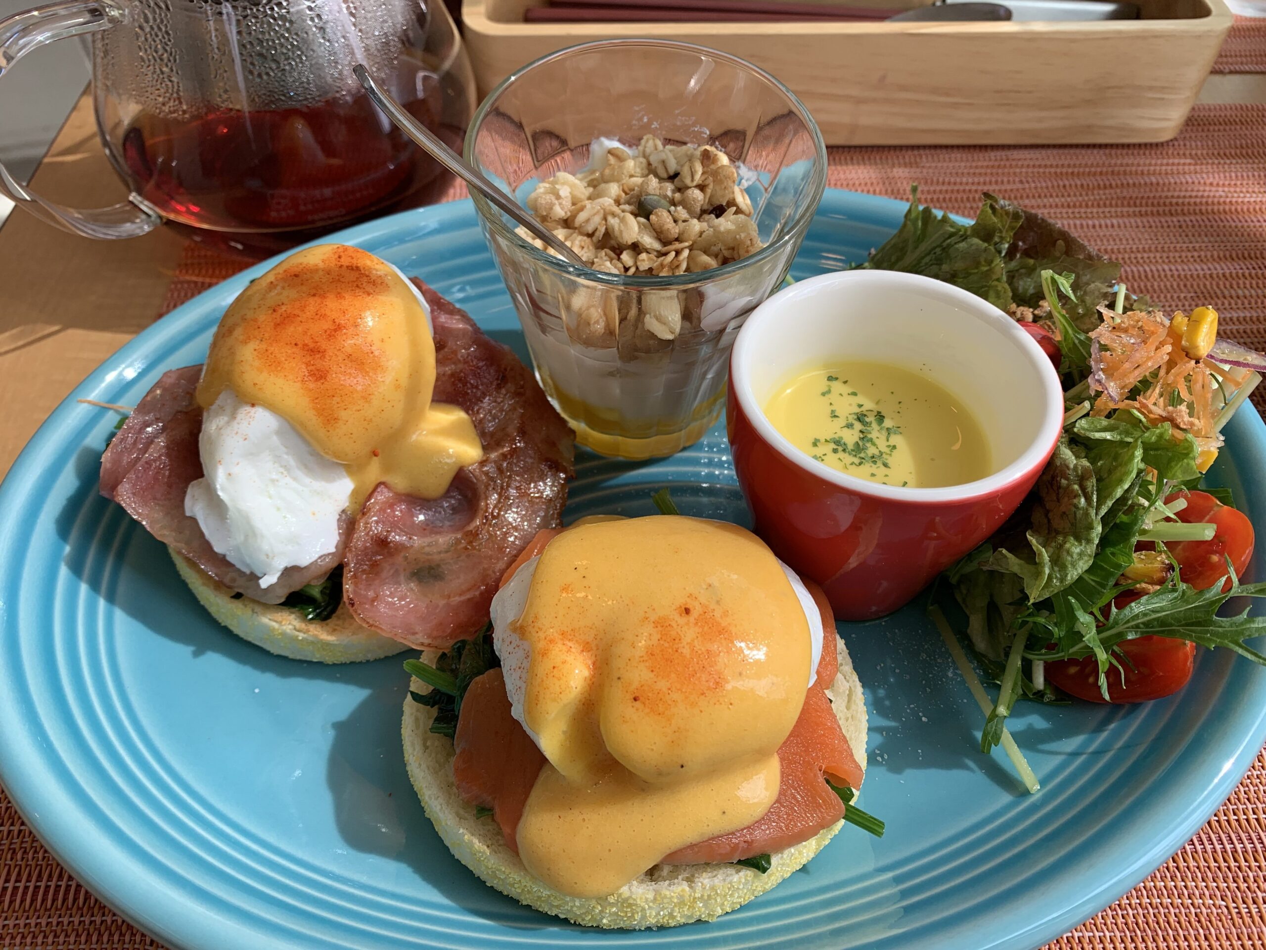 モーニングプレートは、ベーコンとサーモンのエッグベネディクトが1つずつ。カリカリのベーコンと、しっとりしたサーモンが濃厚なオランデーズソースとよく合っていてとっても美味しい!