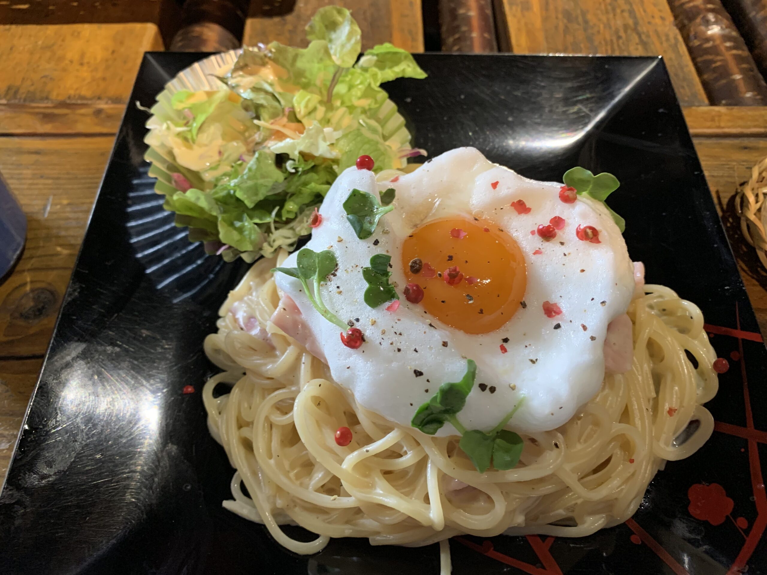 「幸福を呼ぶカルボナーラ」は、白いふわふわのメレンゲがのっていて見た目も楽しい。